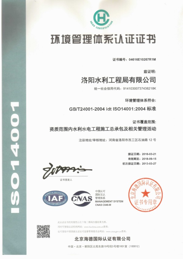 環(huán)境管理體系認(rèn)證證書