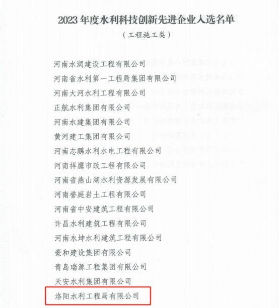 洛陽(yáng)水利工程局有限公司榮獲河南省2023年度水利科技創(chuàng)新先進(jìn)企業(yè)稱(chēng)號(hào)